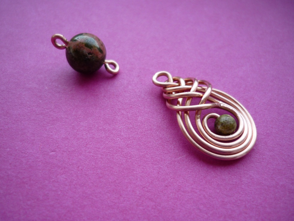 Egy-két mm-es ráhagyással hajlítsunk egy karikát a 30 cm hosszúságú 1 mm-es drótdarabra kúposfogónk hegyén. A drót két szára a karika alatt kell keresztezzék egymást úgy, hogy a rövidebbik essen felülre. Fogjuk tehát kezünkbe a drótot úgy, hogy a rövid drótvég alulra kerüljön, a hosszabbik pedig felül jobbra mutasson. Képezzünk kezünkkel egy ovális formát a hosszabbik drótvégen, majd az ovális forma tetejénél visszaérkező drótot tekerjük körbe jobbról balra a korábban hajlított karika körül. Az ovális forma szélessége - a legszélesebb pontján - kb. 1,5 cm, míg hosszúsága kb. 2,3 cm legyen a karikával együtt mérve. Elől vigyük át keresztezve a drótvéget ismét jobb oldalra, majd hajlítsunk ismét egy ovális formát, amely pontosan az előző belsejébe illeszkedik. Amennyiben túlságosan kidomborodnak a körültekert részek, laposfogónkkal óvatosan kissé lelapogathatjuk őket. A második ovális forma után ismét tekerjük körbe a karikát a dróttal – az előző hurok alatt -, majd hajlítsunk egy újabb, még kisebb ovális formát. Az ovális formájú alakzatok egyre inkább kör alakúvá válnak. Ismét tekerjük körbe a fenti karikát, majd hajlítsuk meg a negyedik, egyben utolsó ovális formát, amely most már egészen kicsire szűkíti a középen található kör alakú rést. A negyedik ovális forma meghajlítása után a visszaérkező drótvéget már ne tekerjük körbe a minta nyakát, vagy pólusát képező karika körül, hanem az ovális forma záródási pontján laposfogónkkal törjük derékszögben lefelé, majd igény szerint vágjuk rövidebbre, kb. 2-3 mm-esre. Ez a hosszúság pontosan elegendő ahhoz, hogy az ásványgolyót felfűzzük rá, és amennyiben pontosan egy síkban fekszik a többi ovális mintával, akkor a Kelta minta megakadályozza, hogy az ásványgolyó leessen a drótvégről. Tehát hajlítsuk kissé az ékszerből kifelé a 2-3 mm hosszúságúra hagyott drótvéget, hogy fel tudjuk rá fűzni a 4 mm átmérőjű ásványgolyót, majd a felfűzést követően hajlítsuk vissza az ékszerbe, egy síkba hozva ezzel az ovális formákat.